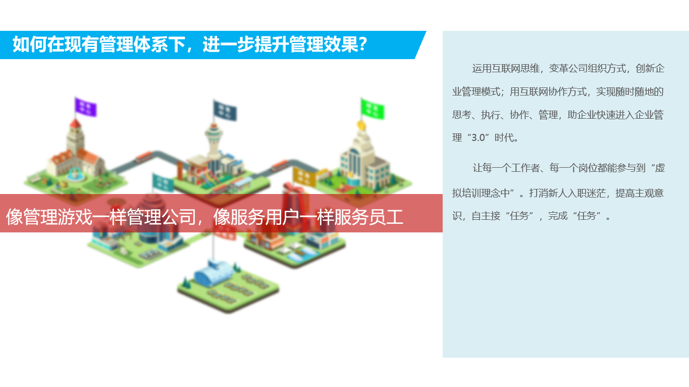 運用(yòng)互聯網思維,變革公司組織方式,創新企業(yè)管理(lǐ)模式;用(yòng)互聯網協作(zuò)方式,實現(xiàn)随時(shí)随地(dì)的(de)思考、執行(xíng)、協作(zuò)、管理(lǐ),助企業(yè)快(kuài)速進入企業(yè)管理(lǐ)☆“3.0”時(shí)代。