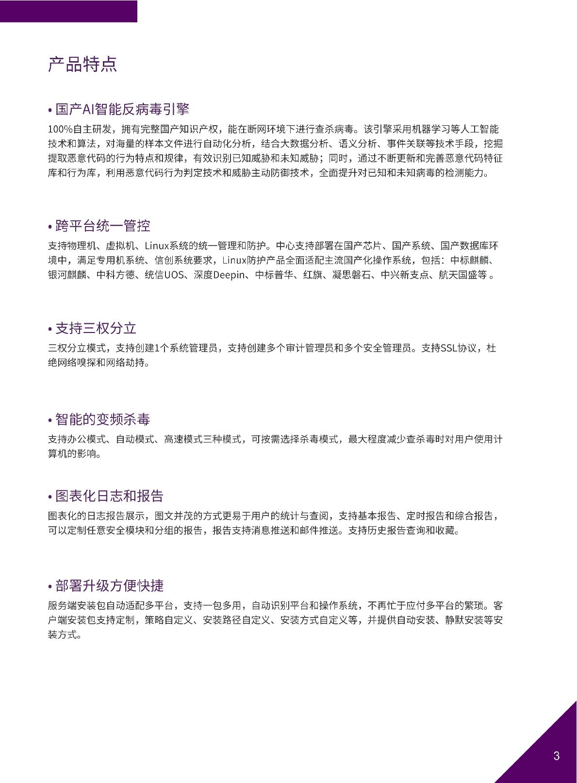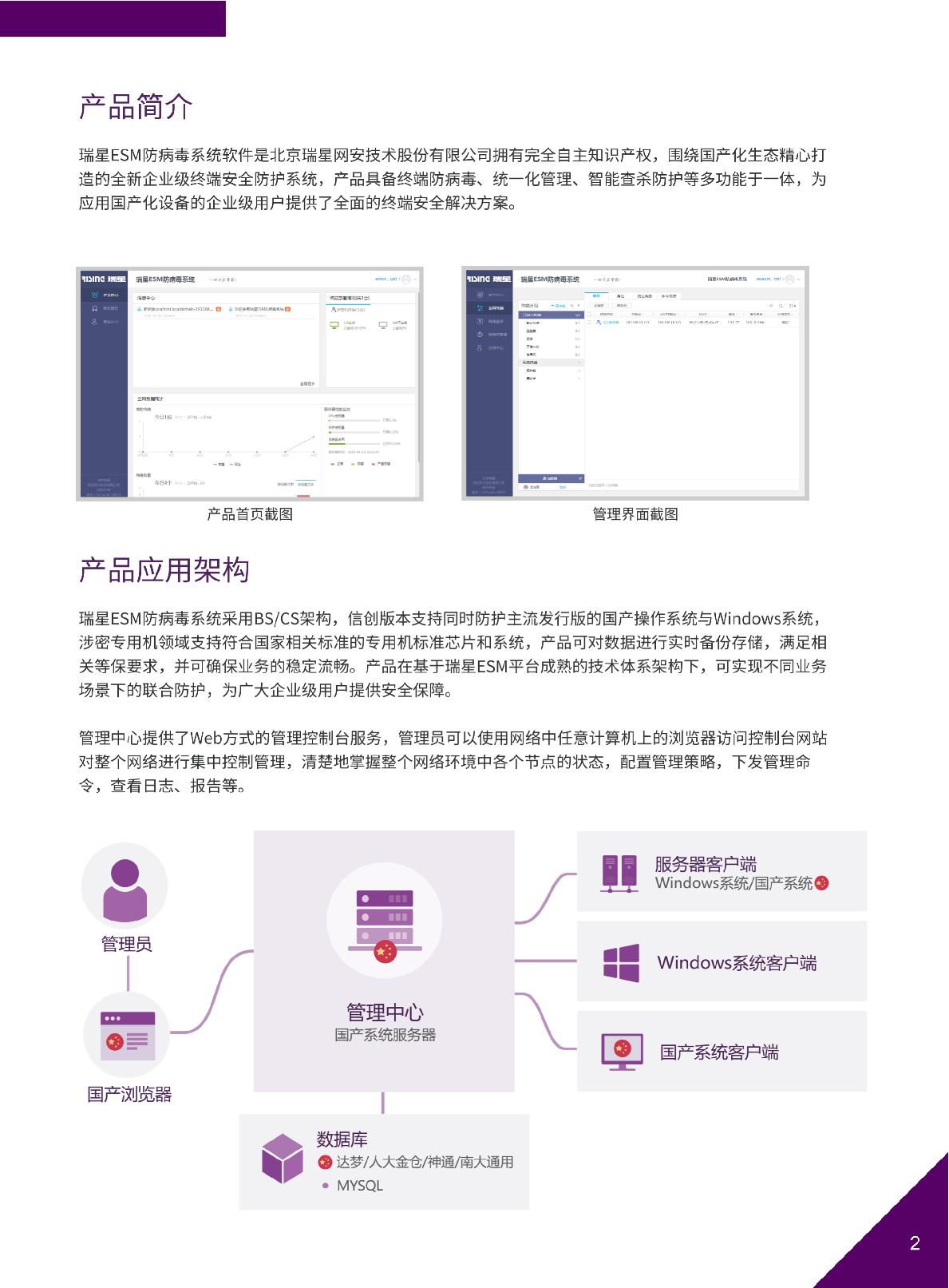 瑞星ESM防病毒系統采用(yòng)BS/CS架構,信創版本支持同時(shí)防護主流發行(xíng)版的(de)國(guó)産操作(zuò)系統與Windows系統, 涉密專用(yòng)機(jī)領域支持符合國(guó)家(jiā)相(xiàng)關标準的(de)專用(yòng)☆機(jī)标準芯片和(hé)系統,産品可(kě)對(duì)數(shù)據進行(xíng)實時(shí)備份存儲,滿足相(xiàng) 關等保要(yào)求,并可(kě)确保業(yè)務的♥(de)穩定流暢。産品在基于瑞星ESM平台成熱的(de)技(jì)術(shù)體(tǐ)系架構下(xià),可(kě)實現(xiàn)不(bù)同業(yè)務 場(chǎng)景下(xià)的(d>e)聯合防護,為(wèi)廣大(dà)企業(yè)級用(yòng)戶提供安全保障.